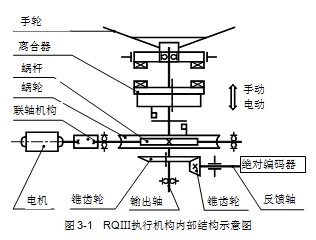 電機(jī)的旋轉(zhuǎn)通過聯(lián)軸機(jī)構(gòu)直接帶動(dòng)蝸桿轉(zhuǎn)動(dòng),蝸桿帶動(dòng)蝸輪轉(zhuǎn)動(dòng),再通過離合器帶動(dòng)輸出軸轉(zhuǎn)動(dòng)。當(dāng)切換手柄撥在手動(dòng)位置時(shí),離合器上移,脫開蝸輪與手輪聯(lián)接,轉(zhuǎn)動(dòng)手輪驅(qū)動(dòng)輸出軸轉(zhuǎn)動(dòng)。電動(dòng)操作總是優(yōu)先,除非操作手柄被鎖定在手動(dòng)檔。在輸出軸轉(zhuǎn)動(dòng)的同時(shí)帶動(dòng)一對(duì)錐齒輪轉(zhuǎn)動(dòng),并通過閥位傳感器檢測(cè)閥位變化。
