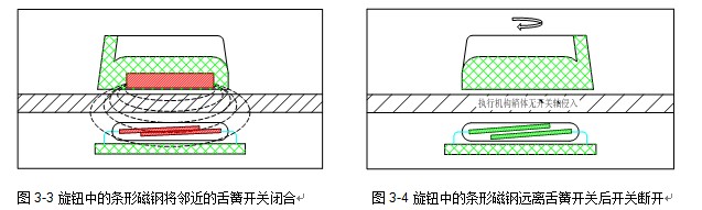 非侵入式設(shè)計(jì)思想體現(xiàn)在兩個(gè)方面。第一,方式選擇旋鈕和就地操作旋鈕采用條狀磁鋼控制電氣殼內(nèi)的舌簧管,摒棄了傳統(tǒng)的旋鈕貫通軸,見圖3-3,圖3-4。第二,采用紅外設(shè)定器對(duì)執(zhí)行機(jī)構(gòu)進(jìn)行參數(shù)設(shè)定、更改、調(diào)試且不需要打開執(zhí)行機(jī)構(gòu)的外殼。非侵入式結(jié)構(gòu)的好處是: