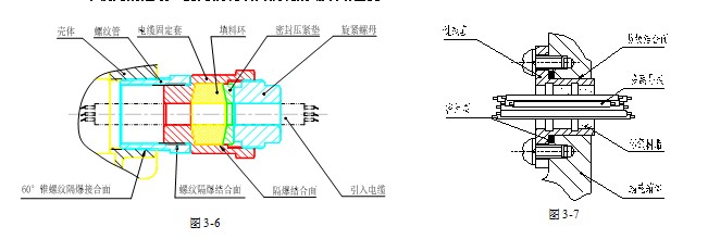 電纜引入裝置是根據(jù)GB3836.2和附錄D《隔爆型電纜引入裝置和襯墊的補(bǔ)充要求》設(shè)計(jì)的隔爆結(jié)構(gòu),詳見圖3-8。螺紋結(jié)合長(zhǎng)度及密封圈和電纜的結(jié)合寬度都符合隔爆標(biāo)準(zhǔn)的要求。