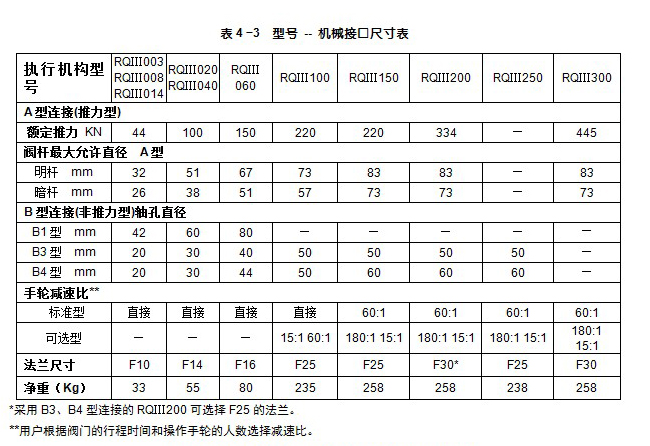 對(duì)于選用RQⅢ003~060執(zhí)行機(jī)構(gòu)形式上看起來應(yīng)該選用B1、B4連接的閥門,如果閥桿有軸向運(yùn)動(dòng)的情況,一定要選A型連接。對(duì)于具體情況如有疑問,請(qǐng)與我公司聯(lián)系。