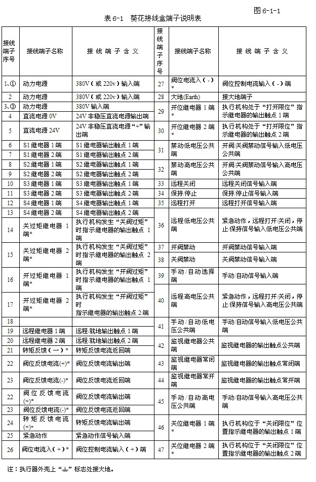 接線式RQⅢ執(zhí)行機(jī)構(gòu)通過葵花接線盒與外部連線,葵花接線盒的接線端子排列見圖6-1-1,接線端子說明見表6-1。