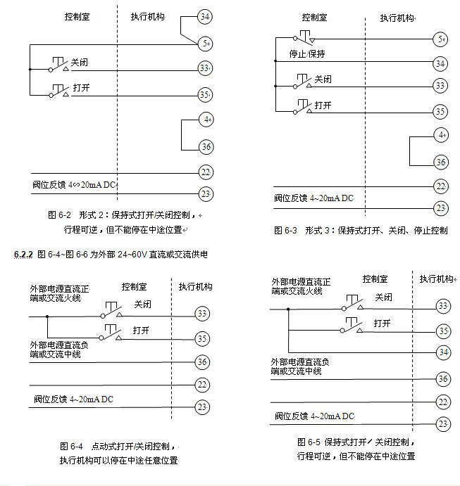 遠(yuǎn)程控制電路可由執(zhí)行機(jī)構(gòu)內(nèi)部的24V直流電源供電,也可以由外部的24V~60V交、直流電源供電,還可以由外部提供的120V~220V直流或交流電源供電,各種形式的接線見圖6-1~ 6-9圖。(圖中序號(hào)為接線端子號(hào))