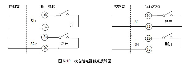 RQⅢ執(zhí)行機(jī)構(gòu)上有4個(gè)狀態(tài)指示繼電器,每個(gè)繼電器無源觸點(diǎn)容量為5A/250VAC或5A/30VDC,每個(gè)繼電器都可以設(shè)定為某種狀態(tài)時(shí)吸合或斷開。關(guān)于狀態(tài)設(shè)定詳見使用說明書。狀態(tài)繼電器觸點(diǎn)接線如圖6-10所示。