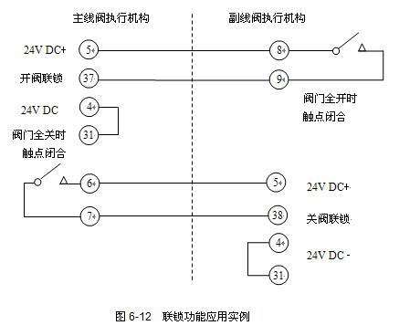 對(duì)于大流量的蒸汽管線進(jìn)行開/關(guān)式控制,為了降低對(duì)執(zhí)行機(jī)構(gòu)轉(zhuǎn)矩的要求,可以在主、副線分別裝一臺(tái)由執(zhí)行機(jī)構(gòu)驅(qū)動(dòng)的閘閥,兩臺(tái)閥門按這樣的邏輯進(jìn)行控制:如果副線閥不在全開位置,主線閥不執(zhí)行打開動(dòng)作,主線閥不在全關(guān)位置,副線閥不執(zhí)行關(guān)閉動(dòng)作。這個(gè)功能即可通過RQⅢ執(zhí)行機(jī)構(gòu)的遠(yuǎn)控聯(lián)鎖功能實(shí)現(xiàn),其外部接線如圖6-12所示。