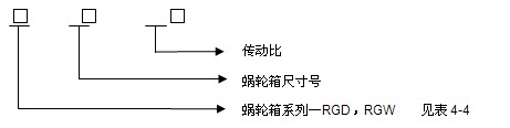 例RGW5-40:1 表示RGW系列,蝸輪箱號(hào)為5,傳動(dòng)化比為40:1的蝸輪箱